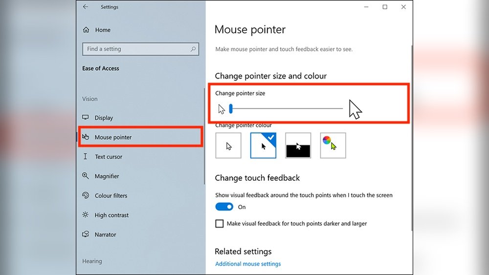Go to Settings > Ease of Access > Cursor & pointer. Adjust the pointer size slider to make your cursor bigger instantly.